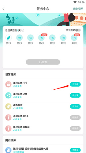 2、在任务列表中找到“课程练习打卡”,完成指定练习即可成功打卡。