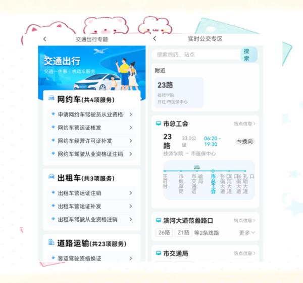 公共服务覆盖教育、医疗、交通等领域;家长可查询学校招生信息、查看学生成绩、参与线上家长会;医疗方面支持预约挂号、查询科室、学习健康知识,节省排队时间;交通出行提供实时公交与路况提示,帮助市民规划路线。