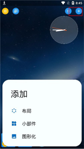 1、打开软件后点击右上角加号,可添加布局、小部件或图形元素。