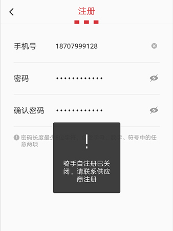 2、但填写信息提交后,系统会提示骑手无法自行注册,需联系指定供应商完成登记。