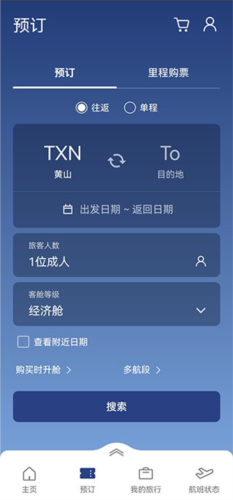 点击下方预定按钮进入机票预订,输入出发地、目的地、乘客人数及舱位等级后搜索,即可查看可选航班并选择合适时间完成预订。
