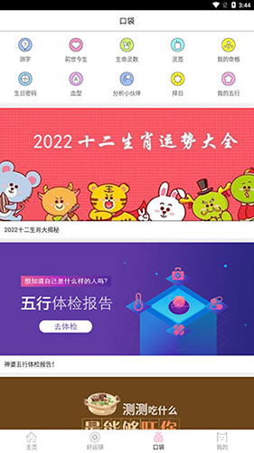 4、口袋页面集合了多项运势分析工具,例如测字、前世今生、生命灵数与生日密码等。