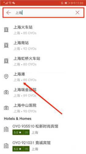2、在搜索框内输入目标酒店名称、所在城市或具体位置,以“上海”为例,选择“上海滩”;