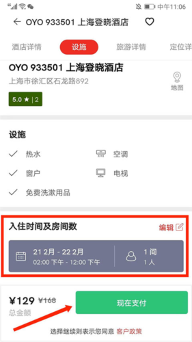 4、设置好“入住时间”与“房间数量”,点击右下角“现在支付”即可完成预订。