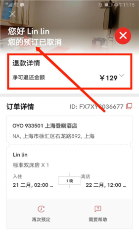 5、页面将提示“订单已取消”,并显示相应的退款金额详情。