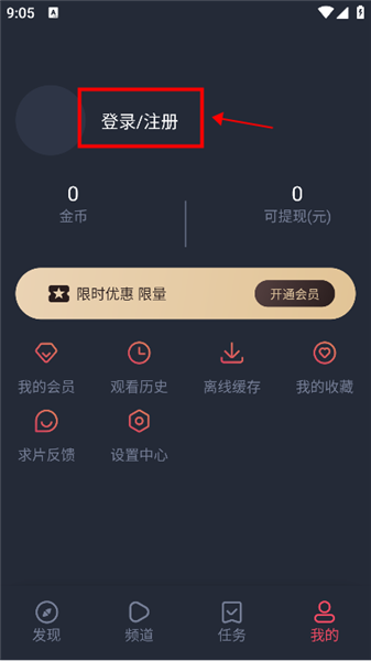 2、首先需要进入【我的】页面,完成登录或注册操作,之后才能正常观看影片。