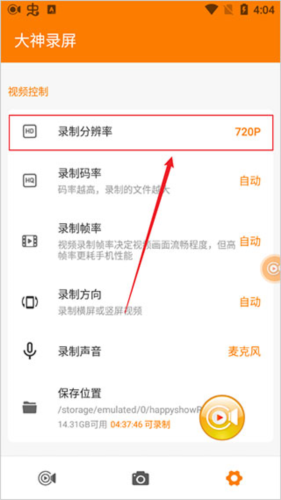 2、进入设置详情页面后,找到并点击“录屏分辨率”选项。