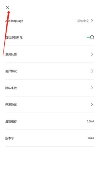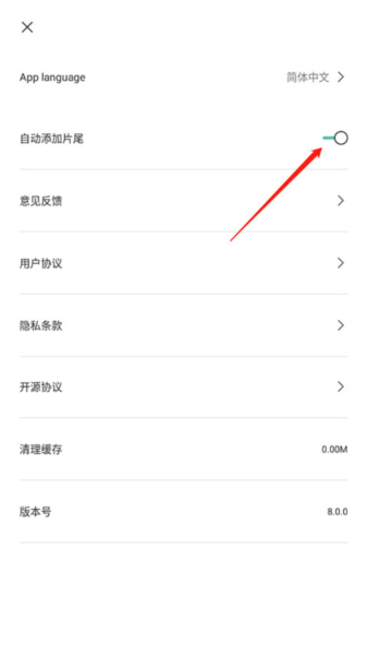 2、进入设置界面,找到自动添加片尾选项,将其右侧的开关按钮关闭。