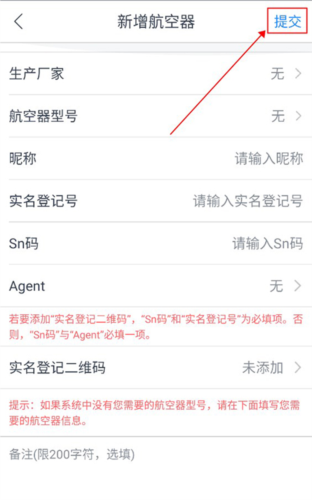 4. 填写无人机制造商、型号、登记号等完整信息,点击提交等待审核通过即完成绑定。