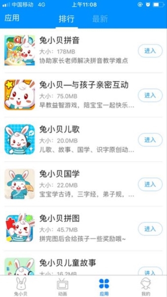 【兔小贝应用】兔小贝开发了一系列让孩子边玩边学的手机早教应用,包括益智小游戏、歌舞、换装、儿童手工、儿童拼图等;后续将陆续推出拼音、汉字、数学、英语学习应用。