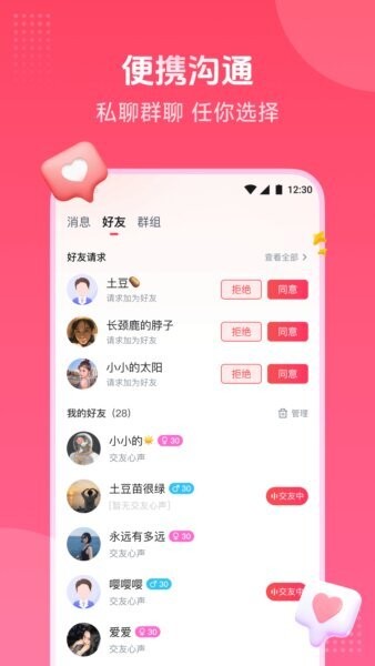 你可以管理好友列表,设置备注或查看状态,随时发起文字、语音或表情聊天,和心动的人深入交流。