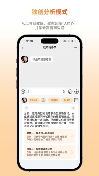 2. 通过“分析模式”从多个角度审视对方意图,包括行为信号和关系进展,并给出具体对话示例,让你逐步提升恋爱洞察力。