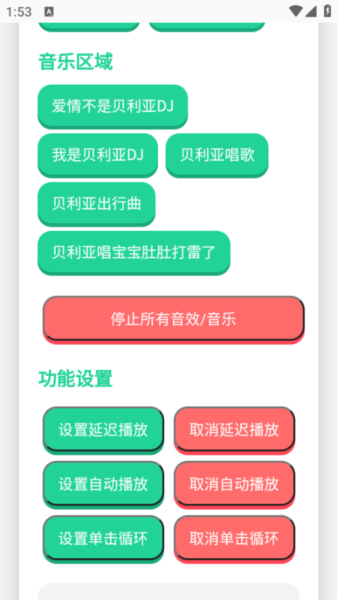 点击对应按钮即可播放音效或音乐,建议提前调整好设备音量。通过“设置延迟播放”按钮可以调整延迟时间,单位为毫秒;“设置自动播放”按钮可开启自动播放模式;“设置单击循环播放”按钮能实现单曲循环功能。如需停止当前所有音频,点击“停止所有音效/音乐”按钮即可。