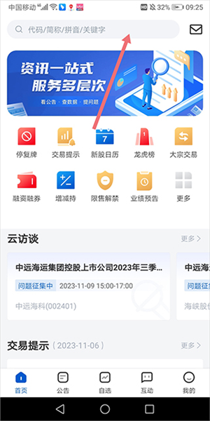 1、启动应用后,点击首页上方的搜索框,输入公司名称或股票代码