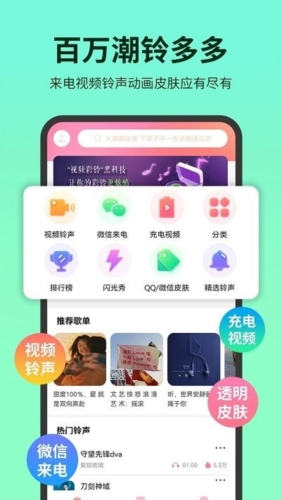 新版本正式上线;铃声资源丰富;内容充实;界面清新;操作简单;热门歌曲铃声持续更新;同时具备来电秀、充电提示音、壁纸等功能。