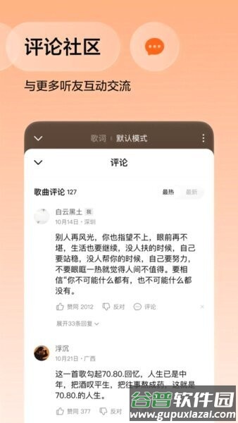互动功能让听歌更有乐趣,在评论区浏览热评或最新讨论,点个赞回复几句,就能和志同道合的朋友聊天。