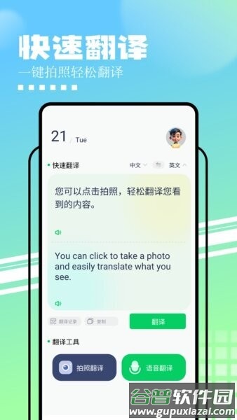 1. 快速翻译:首页突出拍照功能,只需对准文字一拍,就能立即看到翻译结果,适用于各种纸质或数字材料。