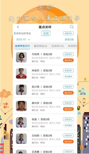 6、重点关怀:自动生成后进生名单,记录家庭信息、现状及培养方向,并可添加评语与访查图片。
