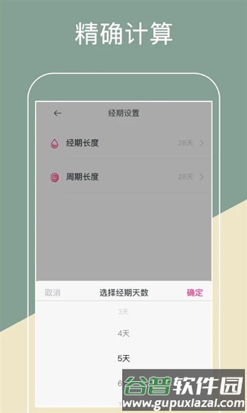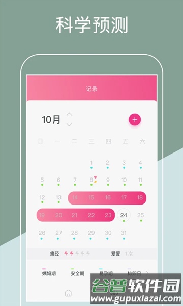 科学预测:输入经期长度与间隔周期后,软件自动进行科学计算,定位安全期、危险期与月经期;