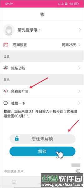1、登录软件后,点击底部“我的”进入个人页面,找到下方广告区域,点击免费去广告选项;