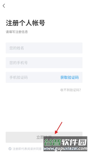 5、按提示填写姓名、手机号,获取并输入短信验证码,最后点击“立即注册”完成操作。