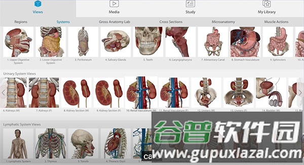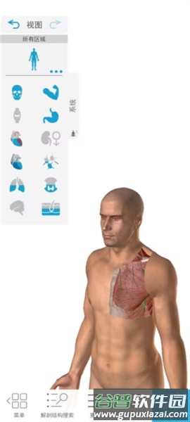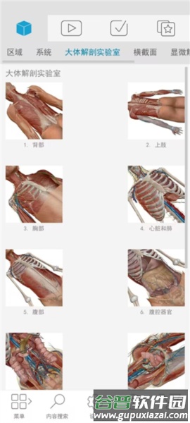 1、进入软件后,可见人体区域、系统、大体解剖实验室、显微镜解剖结构等选项;