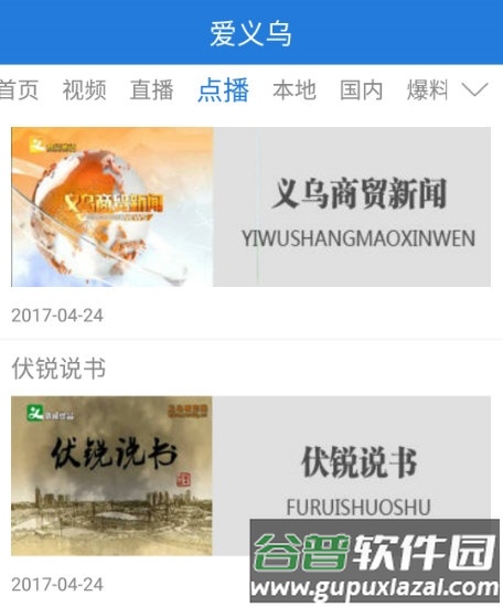 4. 点击首页上方的点播栏目,可选择商贸新闻、伏锐说书等节目观看。