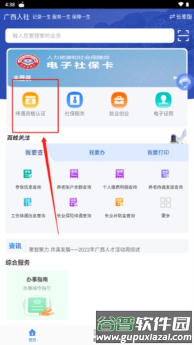 1、安装应用后打开首页,找到待遇资格认证入口。