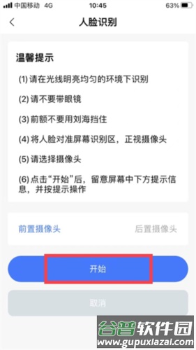 3、核对个人信息无误后点击开始认证,阅读温馨提示,选择前置或后置摄像头,点击开始。