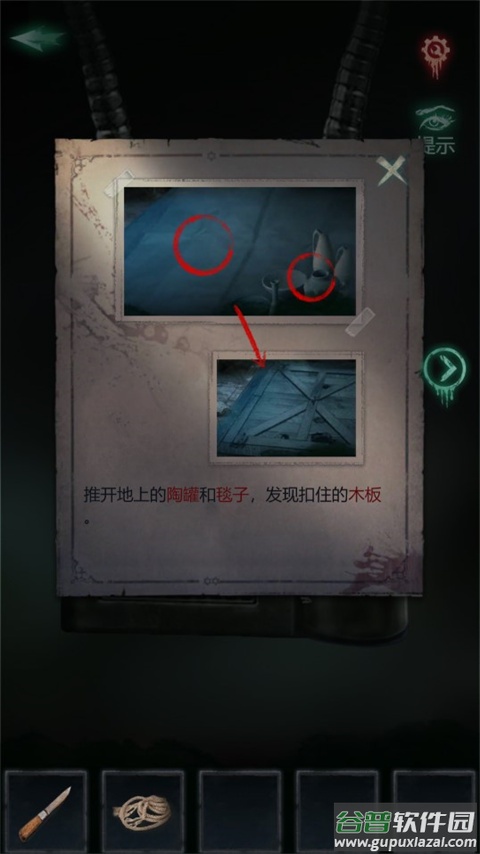 3、使用【铁棍】打开地下通道,使用【一盘绳子】进入地下;