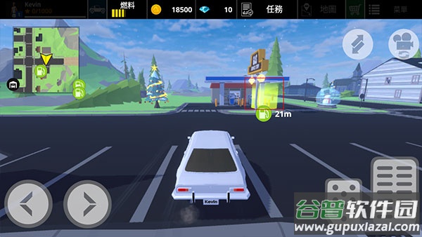 4、根据左上角的地图查看地图的加油站所在的位置,左侧的箭头可以控制汽车方向,右上方的双向箭头可以挪车,摄像头可以切换开车视角,右侧分别是刹车和油门。