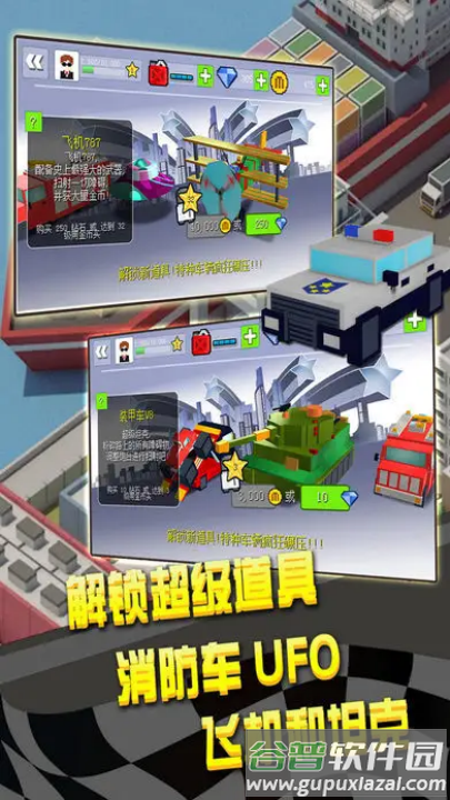 游戏核心玩法围绕竞速与破坏展开,撞击对手车辆不仅能提升排名,还能获得额外加分;多种特殊载具各具特色,消防车拥有强力冲撞能力,UFO具备悬浮特性,合理使用这些载具能事半功倍;赛道中随机出现的道具箱包含加速、护盾等实用道具,及时拾取可扭转战局。