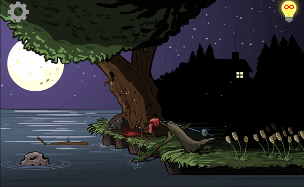 3、树枝掉入河中后,再次点击使虫子爬上树枝;