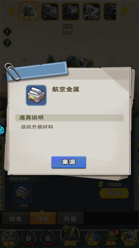 2、消耗航空金属与军饷可提升战机等级,达到特定阶段需使用航空合金进行突破