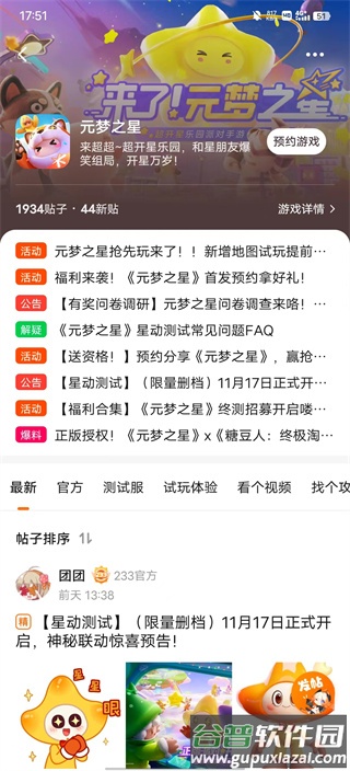 4、社区模块设有各游戏专属圈子,可查看攻略、视频、资讯及测试资格信息,掌握官方第一手消息。