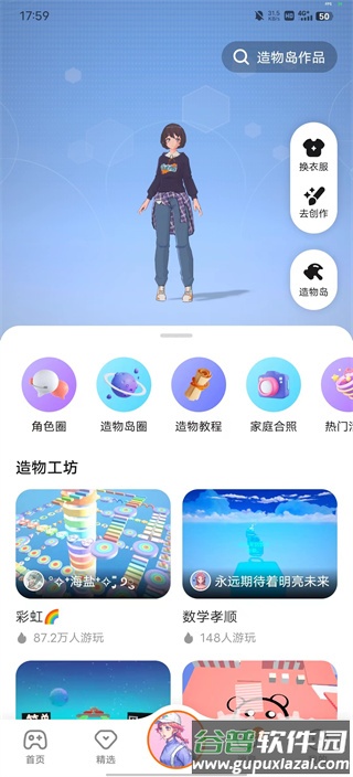 6、内置造物岛功能支持角色捏脸、换装与地图创作,自由度极高,提供详细教程,可邀请朋友共同体验。