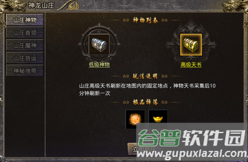 卧龙山庄融合多种玩法模式,包含资源采集、首领讨伐、物资押运等丰富内容。圣物采集分为普通圣物与高级天书两类,高级天书按五行划分,采集后半小时刷新。