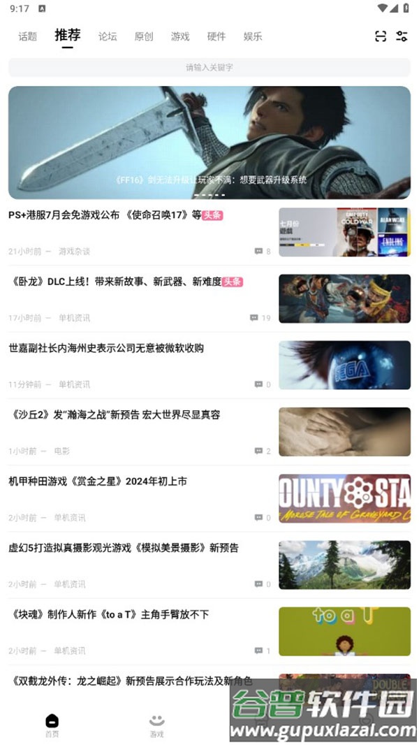 1、首页设计包含话题讨论区、玩家论坛、原创内容、游戏资料、硬件资讯和娱乐版块等分类,用户可根据兴趣浏览不同板块,参与帖子评论或发布个人游戏心得。