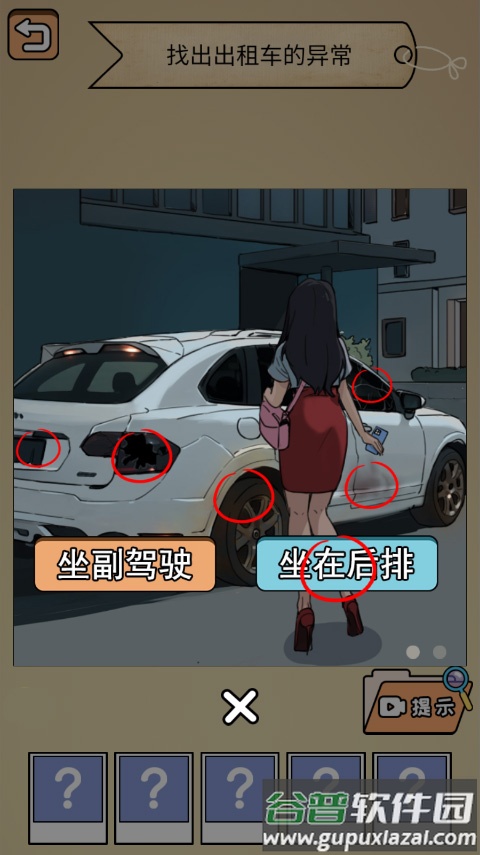一、深夜出租:点击破损车尾灯、空白车牌、异常轮胎及车门血迹,最后选择后排座位;