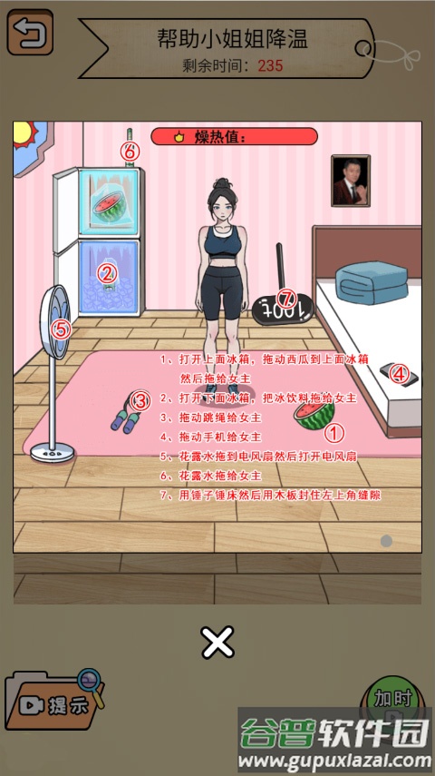 四、帮她降温:取出冰箱里的冰镇西瓜和饮料给角色食用,递过跳绳让她运动,将花露水涂抹后开启电扇,用锤子修复床铺并封堵墙缝;