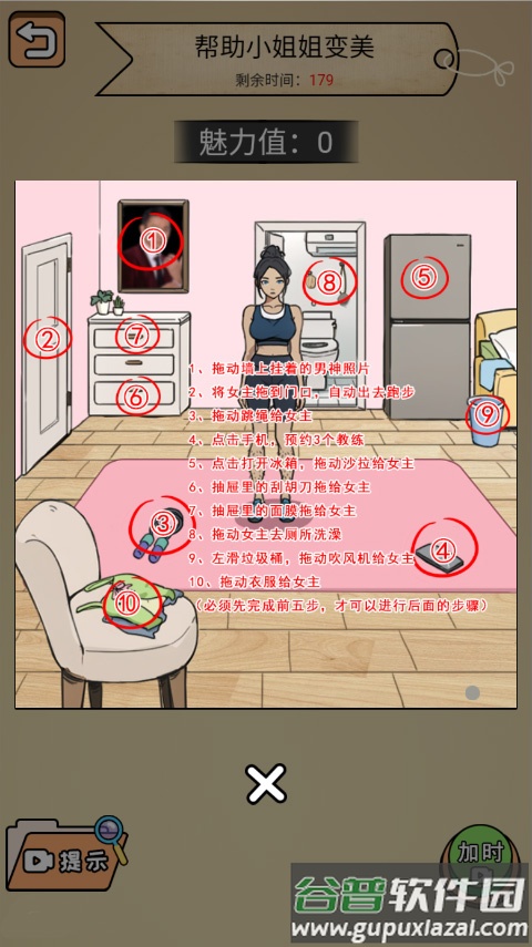 六、变美日记:取下男神照片激励主角,引导她出门跑步,使用跳绳锻炼,预约三位健身教练,制作蔬菜沙拉,使用剃须刀修理眉形,完成沐浴更衣流程;