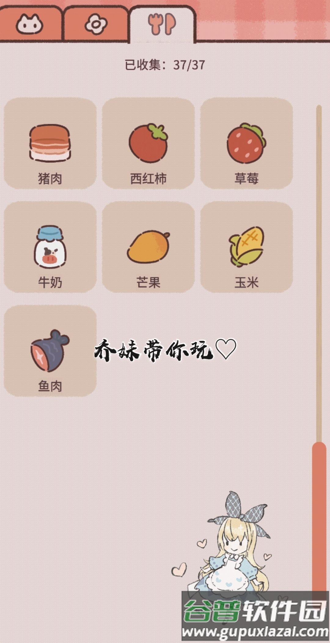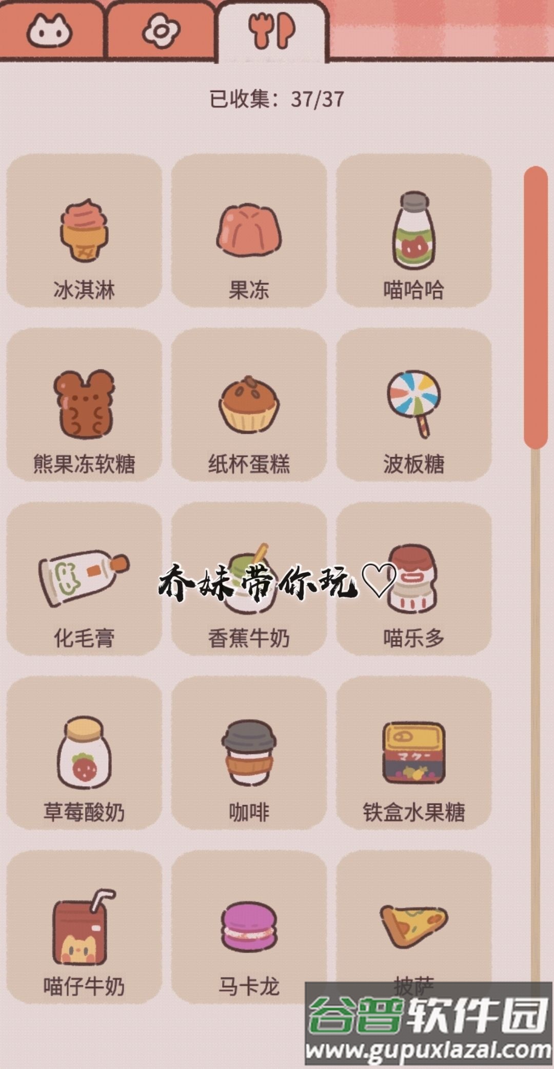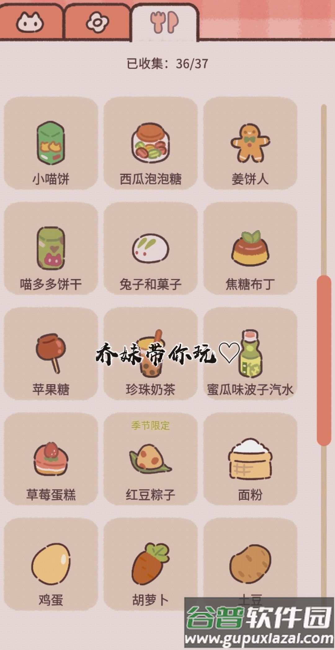 目前已收集38种零食,总数为43种;装修物品收集136件,总数152件,其余等待猫咪赠送。食物类已收集37种齐全。通过种植和饲养可获得面粉、胡萝卜、土豆、西红柿、玉米、草莓、芒果、鸡蛋、鱼肉、猪肉、牛奶;各种蛋糕和饮料需要通过扭蛋机获取。