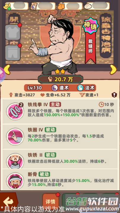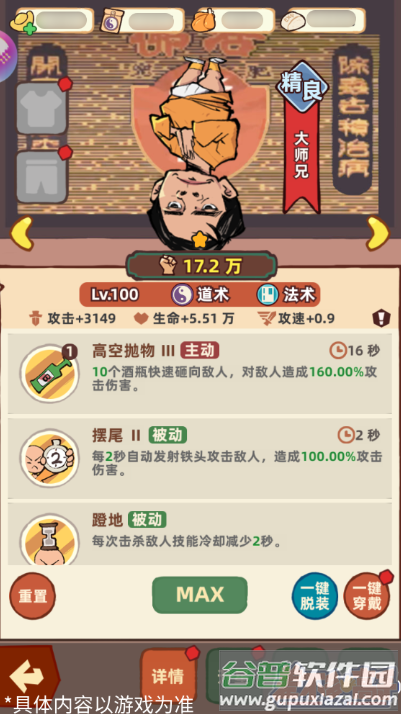 精良品质的大师兄擅长投掷酒瓶,主动技能可同时掷出十个酒瓶攻击目标。被动能力提升攻击频率,每次击败敌人都能缩短技能冷却,形成连续施放的战斗节奏。这位角色适合前期过渡使用。