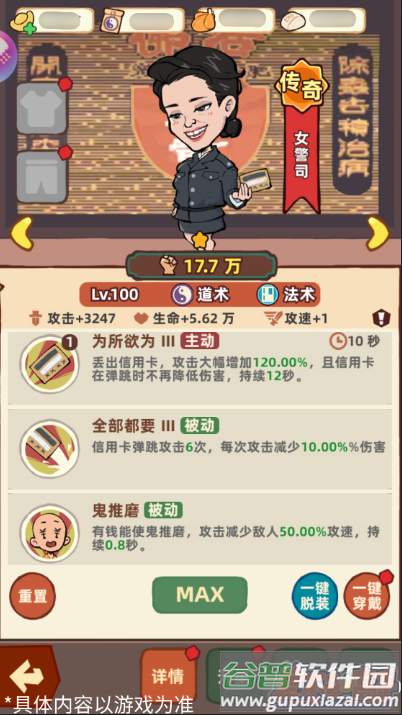 传奇品质的女警司以信用卡为武器,主动技能投出的信用卡会在敌人间弹跳,被动效果可降低目标50%攻速。这位角色在常规状态下就具备优秀的范围清场能力,前期缺乏范围输出时是不错的培养选择。