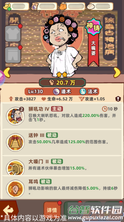 神铸品质的大嘴婆施展主动技能时可击飞范围内敌人并造成眩晕。普通攻击有概率产生范围伤害,还能提升全队道术伙伴的暴击率,削弱敌人的减伤效果。当队伍中道术角色占多数时,这位伙伴能发挥最大价值。