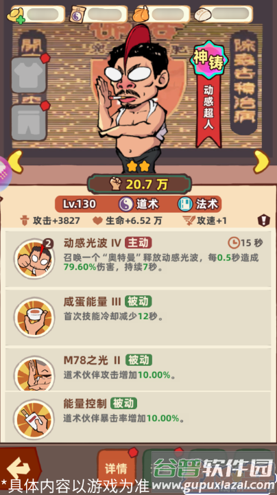 神铸品质的动感超人拥有顶尖的群体杀伤力,主动技能释放的动感光波可对全场敌人造成持续伤害。被动天赋减少首次技能冷却,开局就能快速施展两次大招。这位角色还能提升全队道术伙伴的暴击率和攻击力,抽到后可以其为核心组建战斗阵容。