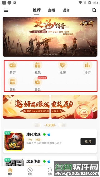 2、主界面显示六个功能区域,包括新游礼包找服排行交易会员;