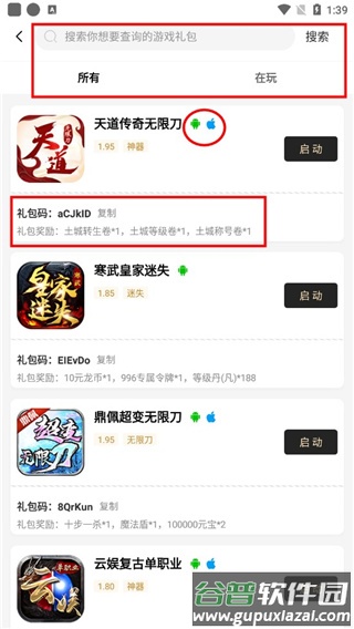 4、礼包区展示可用礼包游戏,支持搜索功能并标注适用平台;