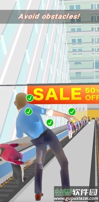1、在限定时间内突破站台重围,穿梭于熙攘人群间,精准把握列车发车时机完成登车目标;