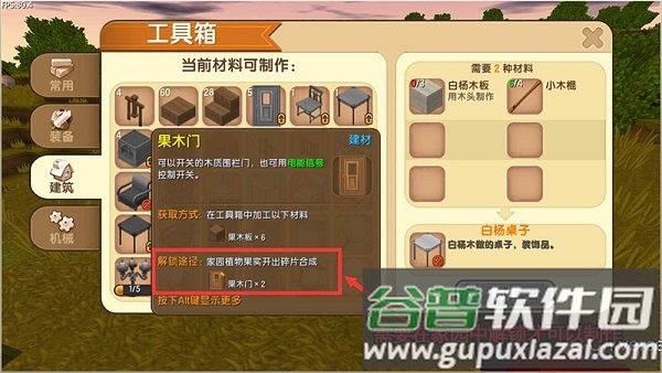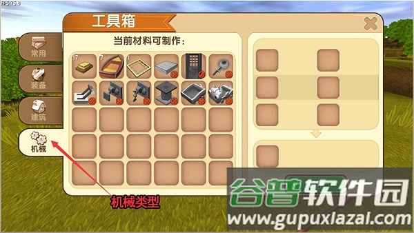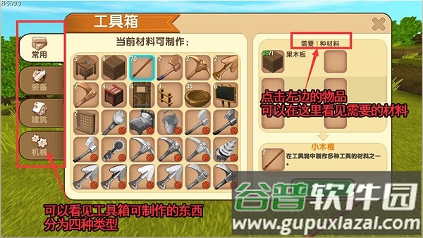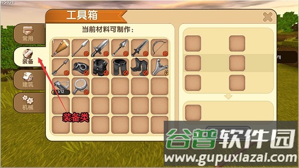 点击工具箱选择制作,完成后从背包取出放置地面。轻触打开加工界面,工具分为四大类别:常用、装备、建筑与机械。